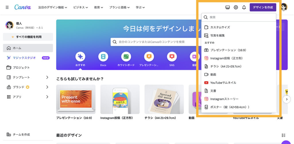 canvaトップ画面上部「デザインを作成」デザインのサイズを選択